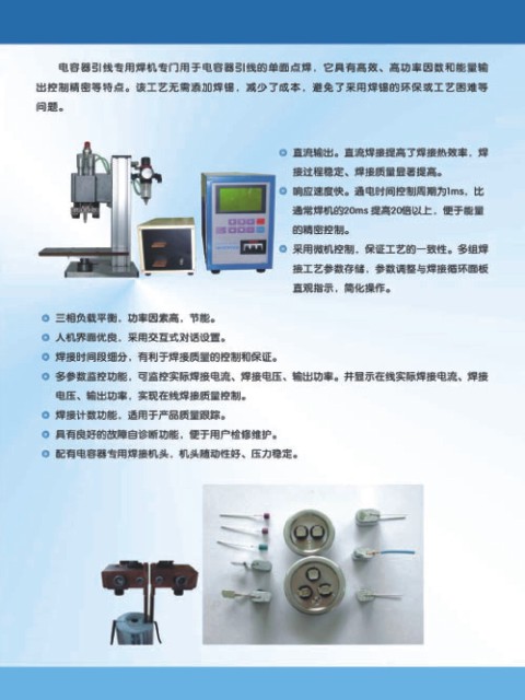 電容器引線(xiàn)專(zhuān)用焊機(jī)專(zhuān)門(mén)用于電容器引線(xiàn)的單面點(diǎn)焊,它具有高效、高功率因素和能量輸出控制精密等特點(diǎn)。該工藝無(wú)需添加焊錫,減少了成本,避免了采用焊錫的環(huán)保或工藝?yán)щy等問(wèn)題。