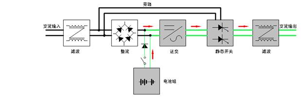 工作原理 電力專用型逆變系統工作方框圖:如圖1所示 A.逆變系統工作于旁路狀態時各部份電路工作原理:市電進入經EMI濾波器濾除市電端送來的雜訊干擾后,由靜態開關送出后經輸出EMI濾波器濾除干擾后送到用戶負載端,為用戶負載提供電能。機器此時的輸出只是經過濾波后而無穩壓、穩頻處理過程的普通市電。 圖2 逆變系統工作于旁路狀態時各部份電路之運作方法 B.逆變系統工作于直流正常供電狀態時各部份電路工作原理,當市電故障時,直流電壓被送到逆變器輸入端,在主控制電路驅動下,逆變器將直流電變成電壓、頻率穩定、無干擾的純正正弦波輸出到靜態開關,由靜態開關將此優質電源送到輸出EMI濾波器后,由EMI濾波器濾除干擾后送到用戶負載端,為用戶提供高品質的電源。 圖3 逆變系統工作于電池正常供電狀態時各部份電路之運作方法