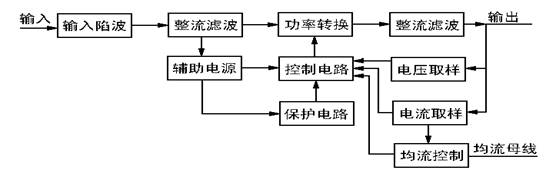交流或直流的輸入電壓經“輸入陷波”電路后到“整流濾波”電路,得到高壓(約300V)直流電壓!肮β兽D換”將高壓直流逆變成約35kHz的高頻交流,經高頻變壓器變換到輸出所需的電壓,再經高頻整流濾波得到輸出電壓?刂齐娐穼敵鲭妷汉洼敵鲭娏魅,閉環反饋后產生脈寬調制(PWM)信號控制“功率轉換”電路,使輸出電壓或電流保持穩定。