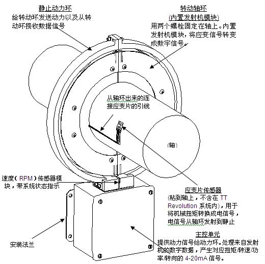TT Revolution系統可同時輸出被測軸的扭矩、轉速、功率和轉向等四種4-20mA信號,適于對轉軸進行長時間監測。系統由兩大部分組成:旋轉的軸環(內置發射機)和固定的電源環及主控單元。軸環外徑和電源環直徑以2英寸步長遞增成系列,適用于不同的軸徑范圍。根據被測軸外徑以及軸環的內徑確定軸襯圈的尺寸。