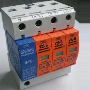 當(dāng)建筑物本身設(shè)有外部避雷系統(tǒng)(如安裝有避雷針、引下線、地網(wǎng)、外部屏蔽時(shí)),根據(jù)IEC、VDE相關(guān)理論,在其建筑物內(nèi)部的380V/230V低壓配電電路上,采用OBO V25-B/3+NPE/FS來(lái)建立電源線上的雷電保護(hù)等電位連接,可以避免雷電發(fā)生時(shí)引起的失火、爆炸、人身傷亡的危害。