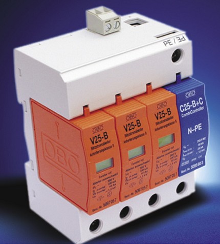 當建筑物本身設有外部避雷系統(如安裝有避雷針、引下線、地網、外部屏蔽時),根據IEC、VDE相關理論,在其建筑物內部的380V/230V低壓配電電路上,采用OBO V25-B/3+NPE/FS來建立電源線上的雷電保護等電位連接,可以避免雷電發生時引起的失火、爆炸、人身傷亡的危害。