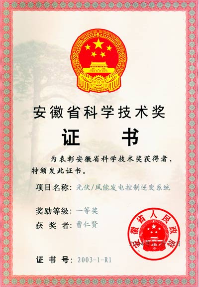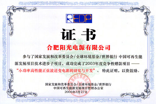 "小功率高性能正弦波逆變電源的研究與開發"項目資格證書