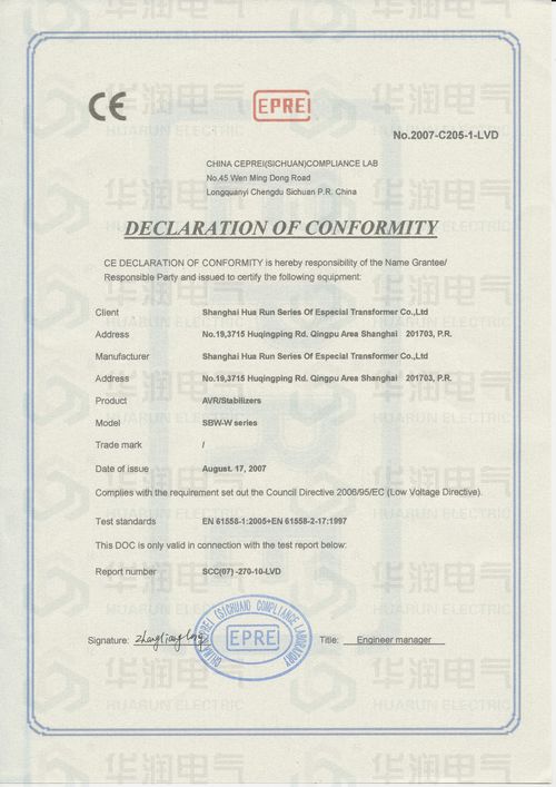 CE產(chǎn)品認證證書(SBW-W無觸點交流穩(wěn)壓器)