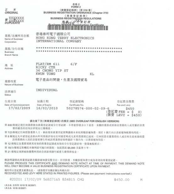 香港泰利電子國際有限公司營業(yè)執(zhí)照