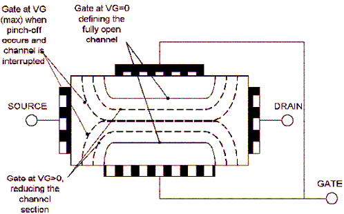 JFET的基本想法(圖1)是通過調節(夾斷)漏-源溝道之間的截面積來控制流過從源極到漏極的電流。利用反相偏置的結作為柵極可以實現這一點;其(反相)電壓調節耗盡區,結果夾斷溝道,并通過減少其截面積來提高它的電阻。由于柵極沒有施加電壓,溝道的電阻數值最低,并且流過器件的漏極電流最大。隨著柵極電壓的增加,兩個耗盡區的開頭前進,通過提高溝道電阻降低了漏極電流,直到兩個耗盡區的開頭相遇時才會出現總的夾斷。