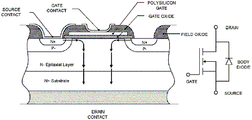 MOSFET利用不同類型的柵極結構開發了MOS電容的特性。通過改變施加在MOS結構的頂端電極的偏置的數值和極性,你可以全程驅動它下面的芯片直到反轉。圖2顯示了一個N溝道MOSFET的簡化結構,人們稱之為垂直、雙擴散結構,它以高度濃縮的n型襯底開始,以最小化溝道部分的體電阻。