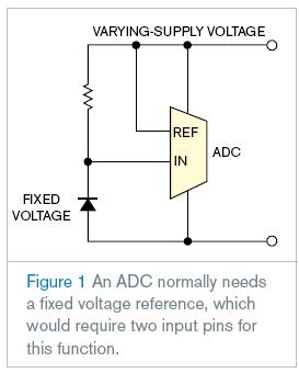 有些微控制器允許在一個(gè)低于3v的供給電壓下進(jìn)行操作。這項(xiàng)功能允許直接從沒(méi)有電壓降和漏電流的3v堿性或者鋰性電池上加電。這個(gè)監(jiān)控電池電壓是十分重要的,來(lái)確保系統(tǒng)的完整性。在這個(gè)設(shè)計(jì)理念下的電路通過(guò)調(diào)節(jié)推進(jìn)功率轉(zhuǎn)換器的占空系數(shù)來(lái)給白色LED背光持續(xù)加電。然而,一個(gè)ADC通常需要一個(gè)固定的基準(zhǔn)電壓(圖一),ADC的這個(gè)功能需要2個(gè)輸入引腳。這個(gè)設(shè)計(jì)理念徹底的顛倒了ADC的建筑結(jié)構(gòu),不用外部引腳就可以提供基準(zhǔn)電壓的功能。