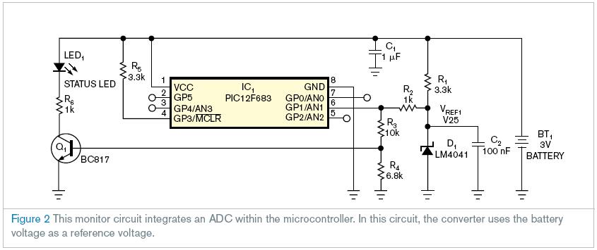 監(jiān)控電路如圖2在微控制器里面與一個(gè)ADC整合到一起。該轉(zhuǎn)換器使用的電池電壓當(dāng)作基準(zhǔn)電壓。這一原理就是通常原理的對(duì)立,通常原理是:你想要用一個(gè)可變的電壓參數(shù)(電池)來(lái)衡量一個(gè)固定的電壓。對(duì)于一個(gè)8位的轉(zhuǎn)換器,這個(gè)例子的結(jié)果是(1.18V/VBAT)×256。注意一個(gè)高值可以說(shuō)明電池電壓低。另外,你可以用微控制器連接到參考點(diǎn)的引腳來(lái)實(shí)現(xiàn)其他的目的。這個(gè)例子,通常使用引腳6 作為脈沖指示燈LED1的輸出端。然而,暫時(shí)的改變端口到模擬輸入模式,你可以在0.1 MSEC內(nèi)完成包括還原,取樣,轉(zhuǎn)換在內(nèi)的電池測(cè)量操作。