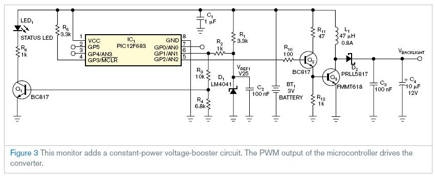 圖三展示了擁有一個(gè)額外的穩(wěn)頻升壓電路的監(jiān)控器。這個(gè)微控制器的PWM輸出端驅(qū)動(dòng)轉(zhuǎn)換器。為了從升壓器得到恒定的功率,需要的占空系數(shù)線性的與ADC的轉(zhuǎn)換值有關(guān)系。