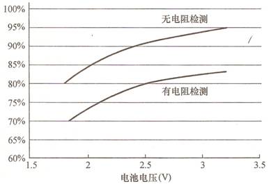 圖2示出了在350mA電流調(diào)整點時的負(fù)載電流調(diào)節(jié)與升壓電壓的效率曲線。在正常的電池電壓范圍內(nèi),工作效率可達(dá)到80%以上,但是隨著電池電壓降低到壽命終點值,效率會降低。另外,圖2還說明了有無檢測電阻的影響。在輸入電壓較高時,效率接近95%,而在輸入電壓較低時,效率將降到80%。曲線的趨勢源自兩個相關(guān)的效應(yīng):一是在高輸入電壓下,輸入電流和開關(guān)電流較低,因此傳導(dǎo)和開關(guān)損耗較低;二是與自耦變壓器極其類似,升壓功率級不處理總輸入功率。功率級處理的功率量與升壓電壓相關(guān),或者與輸入電壓和白光LED電壓之間的壓差相關(guān)。在此設(shè)計中,白光LED的電壓大約為8.7V,因此,在8.2V的高壓線路上,功率級只處理功率的6%[(8.7-8.2)/8.7]。在電流高得多的低壓線路上,功率級要處理8.2V時的4倍功率,即24%的功率。