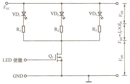 白光LED為電流驅(qū)動器件,光輸出強度由流過LED的電流決定。圖3所示的是由電壓源和限流電阻構(gòu)成的一種簡單偏置電路,流過白光LED的電流由下式確定:IDIODE=(VCC-VF)/(RLIM+RDS(ON)) (1)