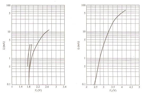 圖4 典型GaAsP正向電壓與導(dǎo)通電流的對應(yīng)關(guān)系 圖5 典型InGaN正向電壓與導(dǎo)通電流的對應(yīng)關(guān)系