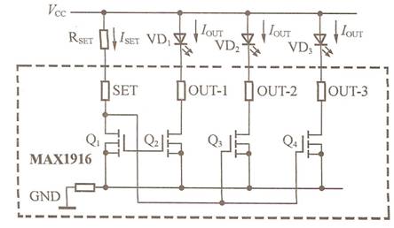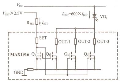 MAX1916為專用白光LED驅(qū)動集成電路,它提供了一種先進的白光LED電流偏置電路。MAX1916在微型SOT-23封裝內(nèi)集成了三組電流源,流過RSET的電流鏡像到三個輸出端,如圖8所示。電路中幾個相同的MOSFET管具有相同的柵源電源,因此,它們的溝道電流相同,電流的大小由鏡像電流ISET決定。MAX1916的最大電流失配度為±5%,“鏡像系數(shù)”為200A/A。也就是說,當(dāng)ISET為50μA時,每個輸出端的電流為10×(1±0.05)mA(最大值)。SET端由內(nèi)部偏置在1.25V。ISET由下式?jīng)Q定: