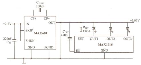 正向電壓為8.5~4.2V(在20mA電流下)的白光LED通常需要升壓變換器,可以用電荷泵(如MAX682~MAX684)與MAX1916共同構(gòu)成這種白光LED的驅(qū)動電路,如圖10所示。MAX682~MAX684能夠?qū)?.7V的輸入電壓轉(zhuǎn)換為5.05V輸出,輸出電流能夠分別達(dá)到 250mA、100mA和50mA。利用MAX684的關(guān)斷控制引腳或MAX1916的使能控制引腳可以關(guān)閉白光LED。在圖10所示電路中, MAX684在關(guān)斷模式下,電源電流降至22μA;RSET=43kΩ時,白光LED的電流為22mA。