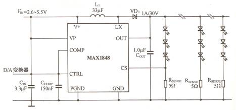 白光LED的亮度可以通過MAX1848的CTRL引腳的D/A變換器調(diào)節(jié)或電位器分壓電路調(diào)節(jié),電壓控制范圍為+250mV~+5.5V,將控制引腳接地可實現(xiàn)關(guān)斷。負(fù)載功率為800mW時,電路轉(zhuǎn)換效率達(dá)88%。