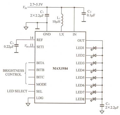 (4)由MAX1984構(gòu)成的白光LED驅(qū)動電路