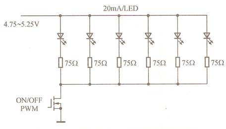 選用白光LED最明顯的問題是產(chǎn)品的匹配性差。按照白光LED的典型規(guī)格,電流20mA時正向電壓的最小值為3.0V,典型值為3.5V,最大值為 4.0V。顯然,穩(wěn)壓源不是合理的解決方案。利用相同的電流驅(qū)動每只LED可以獲得均勻亮度,但成本很高。在許多應(yīng)用中只是簡單地用一個固定偏置電壓和限流電阻驅(qū)動白光LED,如圖14所示。
