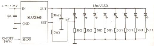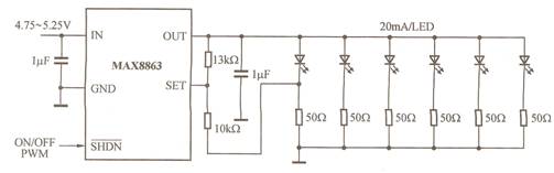 圖16所示電路是對圖15所示電路的改進,適合便攜式產(chǎn)品的背光光源要求。MAX8863可以驅(qū)動8只白光LED,每只白光LED的電流為15mA。當(dāng)白光LED的正向電壓較低或限流電阻的電流低于15mA時,所允許的輸入電壓更低,對不同廠商、不同批次的白光LED可提供較好的亮度匹配。