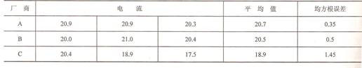 從表1中的平均值可以看出,不同廠商提供的白光LED的一致性較差,其中A廠商提供的白光LED的吸取電流最大(平均24.6mA),B廠商提供的白光 LED的吸取電流最小(平均為18.3mA)。不同廠商的白光LED的電流在采用相同的偏置電壓、相同的限流電阻時差別較大,均方根誤差為3.27mA。
