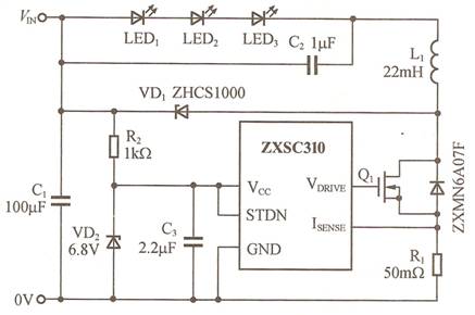 當(dāng)MOSFET管(Q1)導(dǎo)通時,電流從輸入端流過白光LED、并聯(lián)濾波電容器(C2)、電感(L1)、Q1及檢測電阻(R1),電流值由檢測電阻值和ZXSC310檢測電壓的閾值(通常為19mV)所決定。