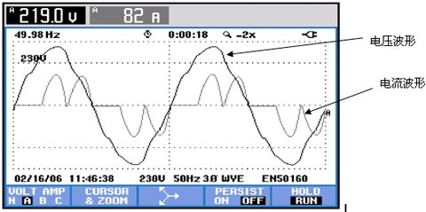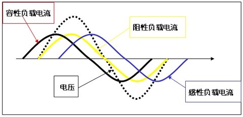 虛線代表電壓波形,我們的市電波形正常為幅值220V,頻率50HZ的正弦交流電,當(dāng)負(fù)載電流的波形也是50HZ的正弦波形時(shí),我們稱此類負(fù)載為線性負(fù)載,當(dāng)電流波形相位與電壓一致時(shí),我們稱為阻性負(fù)載,如圖1的黃色線,如常見的白幟燈、電路、電熱水器。當(dāng)電流相位超前于電壓時(shí),我們稱此類負(fù)載為容性負(fù)載,如圖1中的黑色線,純?nèi)菪载?fù)載比較少,如一般配電室常用的無(wú)功補(bǔ)償柜就是純?nèi)菪载?fù)載。當(dāng)負(fù)載電流相位滯后于電壓波形時(shí),此類負(fù)載稱為感性負(fù)載,如圖1的藍(lán)色線,常見感性負(fù)載如電動(dòng)機(jī)、變壓器、電感式鎮(zhèn)流器日光燈。