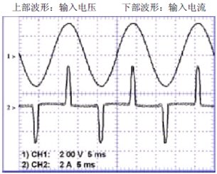 可以看出其電流波形相對(duì)電壓的正弦波形相差很大,圖3是一般三相電源常見的變頻器輸入電流波形: