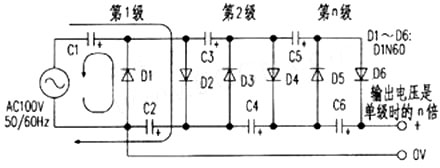 其工作過程是,首先在交流的負半周時交流電源經D1對C1充電,接著在正半周時交流電源與C1上的電壓相加經D2對電容器C2充電,充得的電壓是電容器C1充電電壓的兩倍。接下來在負半周時,除了電源經Dl對電容器C1充電之外,交流電源還與C2上的電壓疊加經D3對C3、C1充電,C3上的充電電壓是C1上的兩倍。在正半周時交流電源與C1上的電壓疊加,除了經D2對電容器C2充電之外,還與C1、C3上的電壓疊加經D4對電容器C4和C2充電,C4上充得的電壓是電容器C1上電壓的兩倍。以此類推,可知輸出的直流電壓與半波倍壓整流電路的級數有關。圖中串接有三級半波倍壓整流電路,C2、C4、C6上的充電電壓均為C1上的充電電壓的兩倍,三個電容串聯之后充電電壓為C1上充電電壓的6倍。 ■