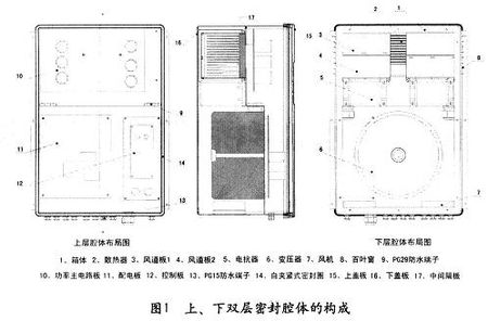 中間隔板下層安裝有散熱器2,風道板3、4,電抗器5,變壓器6;箱體1下底部裝有風機7;箱體l兩側(cè)面裝有百葉窗8;下蓋板16與箱體1固定;這樣整個箱體1中間隔板下層就形成一個相對封閉的腔體;中間隔板與箱體周邊、散熱器與中間隔板貼合面周邊涂上防水密封膠,電抗器、變壓器都由環(huán)氧灌封,有效進行防水。整個腔體能達到IP54的防護等級。