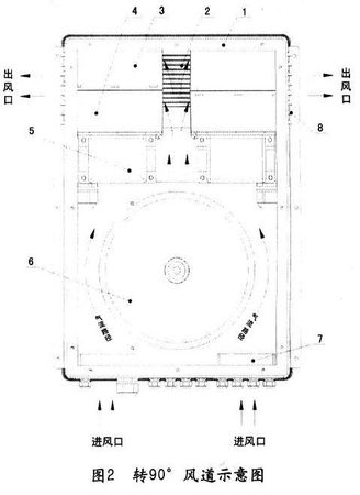 1)由風機7、散熱器2、風道板3/4、百葉窗8形成轉(zhuǎn)90°風道。