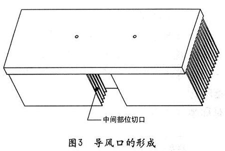 3)為實現(xiàn)轉(zhuǎn)90°的風道,散熱器的齒需要特殊加工,將其中的幾片齒從中間銑去一部分,形成導風口,如圖3所示。