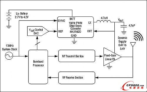 開關型調節器改善發送效率的基本原理是,通過動態調節功放的供電電壓,使其剛好能夠滿足功放中射頻信號的幅度要求(見圖1)。采用開關調節器高效率地實現這種調節,在峰值發送功率以外的任何工作條件下,都可大幅度地節省電池功率。因為峰值功率只有在手機遠離基站和數據傳送時需要,總體來講,這種方案的省電效果是非常顯著的。