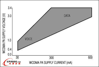 圖2. 固定增益的雙極型W-CDMA功率放大器的典型負載曲線中有一個明顯的阻性成分。電源電壓和電流會從最低的0.4V/30mA (12mW)變化到最高的3.4V/600mA (2040mW),話音的發送一般在1.5V/150mA (225mW)下進行,高速數據的發送一般在2.5V/400mA (1000mW)下進行。