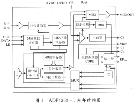 ADF4360-1主要由數字鑒相器、電荷泵、分頻器、計數器及雙模前置P/(P+1)分頻器等組成。如圖1所示。