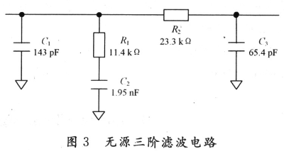 利用AD公司提供的專用設計與仿真工具軟件ADI simPLL對圖2結構形成的無源三階濾波電路進行仿真、設計。依照軟件提示,逐步設定各項參數,并選擇芯片型號和環路濾波器形式,最后生成的電路如圖3所示。