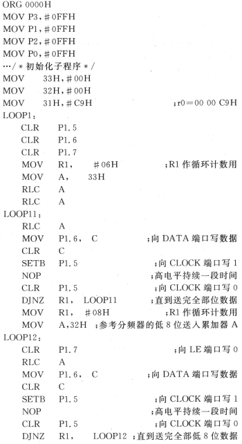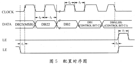 單片機P1.5,P1.6,P1.7三個I/O口分別與芯片CLK,DATA,LE相連。圖5給出了數據輸入的時序圖。數據(DATA)在每個時鐘(CLOCK)的上升沿從MSB(最高有效位)開始依次寫入24位移位寄存器中,直到LSB位寫入完成之后,由來自LE的上升沿將存儲在24位移位寄存器中的數據一次性鎖存入目標寄存器(包括R計數鎖存器、N計數鎖存器、功能鎖存器以及初始化鎖存器),再進行下一個目標寄存器的初始化。寄存器賦值順序為R-C-N,目標寄存器的選擇由移位寄存器最末兩位DB0,DB1來決定,其中C和N寄存器的賦值時間間隔應大于5 ms。