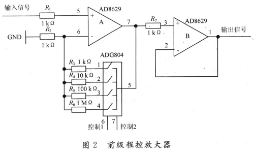 該部分中,實現(xiàn)增益控制主要依靠通道選擇,本方案中采用四通道選擇器ADG804,該器件導(dǎo)通電阻小于0.8 Ω,單電源供電,封裝小,溫度適應(yīng)性強,通過地址線A0和A1選擇導(dǎo)通路。單片機I/O口送數(shù)至ADG804的地址輸入端,選擇不同的反饋電阻值Rf,通過式(1)得到不同的放大增益系數(shù)G,進而確定事先定義的不同檔位的切換。G=Vo/Vi=Rf/Ri (1)