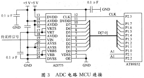 選擇使用AD775作為本方案中的A/D變換器。AD775是一款CMOS、低功耗、8位、20 MSPS采樣模數(shù)轉(zhuǎn)換器(ADC),內(nèi)置采樣功能和片內(nèi)基準電壓偏置電阻,可提供完整8位ADC解決方案。它采用流水線式或乒乓兩步式FLASH架構(gòu),可提供最高35 MHz的采樣速率,同時保持極低的功耗(60 mW)。該器件融合了出色的微分非線性(DNL)、高采樣速率、低差分增益與相位誤差、極低功耗以及+5 V單電源工作等特性,其參考電阻可采用多種配置方式進行連接,以處理不同的輸入范圍。與傳統(tǒng)的FLASH型轉(zhuǎn)換器相比,低輸入電容提供易于驅(qū)動的輸入負載。圖3給出ADC的外圍電路以及和MCU數(shù)據(jù)傳輸?shù)倪B接關(guān)系。