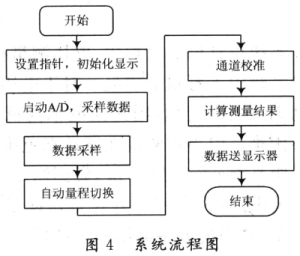 軟件設(shè)計采用模塊化設(shè)計思想,每個模塊實現(xiàn)特定的功能。系統(tǒng)軟件包括主程序、定時中斷程序和一系列功能子程序。上電后程序初始化,進入監(jiān)控狀態(tài),顯示待機界面等待測量。測量時啟動A/D后,首先選擇最大量程對外部數(shù)據(jù)進行采樣計算并判斷,確定合適的量程。切換量程后再次采樣,記錄得到的數(shù)據(jù),通過相應(yīng)對相應(yīng)量程的計算,得到測量的電壓。如果需要,MCU可與微型打印機通過并口連接,將存儲于RAM中的電壓歷史數(shù)據(jù)和當前數(shù)據(jù)打印出來,作為資料存檔保留,系統(tǒng)流程圖如圖4所示。