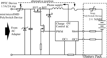 圖1是一個(gè)典型的電池充電電路。其中,交流電通過AC/DC電源適配器轉(zhuǎn)變?yōu)楹线m電壓對(duì)電池組進(jìn)行充電。PPTC元件與過壓保護(hù)元件協(xié)調(diào)作用共同完成下列工作: