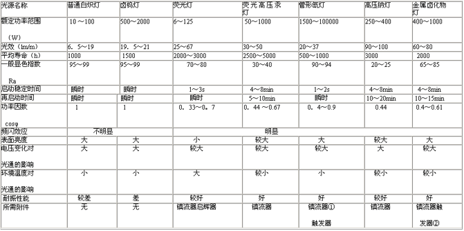 常用照明電光源的主要特性比較表1