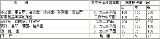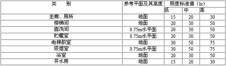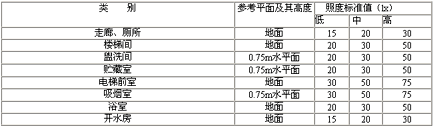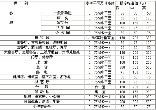 注:1.客房無(wú)臺(tái)燈等局部照明時(shí),一般活動(dòng)區(qū)的照明可提高一級(jí);