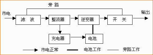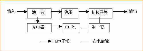 UPS主要分為兩大類三種形式:一類是后備式,另一類是在線式,還有一種介于 兩者之間的在線互動式。這是在線式UPS的原理圖,主要由整流器、逆變器、靜態轉換開關和后備電池組成。輸出的交流電源是經過逆變器重新產生,其電壓、波形頻率由UPS本身控制,具有穩壓、穩頻、凈化和不間斷等功能。