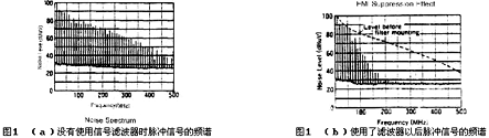 線路板上的導線是最有效的接收和輻射天線,由于導線的存在,往往會使線路板產生過強的電磁輻射。同時,這些導線又能接收外部的電磁干擾,使電路對干擾很敏感。在導線上使用信號濾波器是一個解決高頻電磁干擾輻射和接收很有效的方法,圖1(a)是沒有使用信號濾波器時脈沖信號的頻譜,可以看出,脈沖信號的高頻成份很豐富,這些高頻成份可以借助導線輻射,使線路板的輻射超標。(b)是使用了濾波器以后,脈沖信號頻譜發生的變化。從圖中可以看出,脈沖信號的高頻成份大大減少了,由于高頻信號的輻射效率較高,隨著高頻成份的減少,線路板的輻射將大大改善。