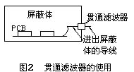 屏蔽殼體上不允許有任何導線穿過,屏蔽效能再高的屏蔽體,一旦有導線穿過屏蔽體,屏蔽體的屏蔽效能就會大幅度下降。這是因為導線充當了接收干擾和輻射干擾的天線。當有導線要穿過屏蔽體時,必須使用貫通濾波器,如圖2所示。這樣可以將導線接收到的干擾濾除到屏蔽體上,從而避免干擾穿過屏蔽體。