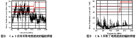 設備中的電纜是接收干擾和輻射干擾最有效的天線。干擾主要通過電纜進出設備。解決電纜接收和輻射干擾的主要手段有屏蔽和濾波。雖然使用屏蔽電纜能夠有效地減小電纜的電磁干擾輻射和接收電磁干擾的能力,但屏蔽電纜的屏蔽效能對屏蔽層的端接方式依賴很大,并且屏蔽電纜的屏蔽層由于是金屬編織網構成的,在高頻時屏蔽效能較差。為了改善這種狀況,在屏蔽電纜的兩端使用濾波器是有效的方法。圖3是一個電纜濾波的例子。圖3(a)是計算機設備的電纜沒有經過濾波時的輻射頻譜,從圖可以看到,其輻射強度已經超過CISPR規定的標準,這種設備是不能銷售的。圖3(b)是在計算機的電纜上使用了連接器形式的信號濾波器后的輻射頻譜,可以看到,其輻射強度已大大減小,已經滿足了CISPR標準B級的要求,可以上市銷售。