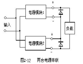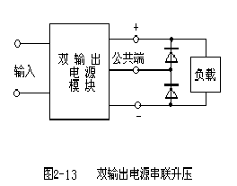 一般來說,幾個電源可以串聯使用。但是一個電源的輸出可能會影響另一個電源的反饋回路。一般情況下,兩臺電源的紋波電壓不會同步串聯工作將會有附加的紋波電壓。串聯使用的另一個限制條件是串聯后總輸出電壓不能超過任何一個電源的擊穿電壓。如果不同電源串聯時,串聯后的最大輸出電流等于額定電流最小的那臺電源的額定電流。兩臺電源串聯使用的電路如圖2-12所示。圖中每個電源輸出端都并聯一只反偏二極管,以免反向電壓加到任一電源上,二極管的反向耐壓大于兩個電源輸出電壓總和,平均電流應大于電源輸出電流的兩倍。另一種常用的串聯方法是,將一臺雙輸出電源串聯作為一臺高壓輸出電源,如圖2-13所示。輸出電壓已經利用公共端串聯,因此,它只能懸浮公共端,將負載直接與正、負輸出端相連。例如,用這種方法獲得24V、30V或36V電壓,可以分別用±12V、±15V或±18V雙輸出電源來實現。