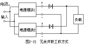 冗余技術是電源并聯運行的一個好方法。圖2-15給出兩臺電源冗余并聯方式。為達到100%冗余,每一臺電源必須提供總的負載電流。在這種情況下,不存在負載均衡的問題。圖2-15中兩臺電源輸出端通過二極管并聯,二極管允許其中一臺失效時并不影響另一臺電源繼續給負載供電。這種方式常用于不允許電源出故障的重要場合。應該注意到,在不間斷的直流供電系統中,其中一臺電源可用電壓相等的電池替代。