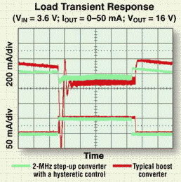 首先是快速的瞬態響應。最近市場上已有開關頻率高達2MHz的升壓轉換器,對負載變化有快速的響應,如AnalogicTech公司的AAT1230。