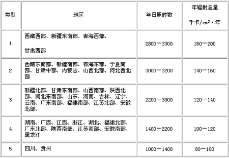 我國屬太陽能資源豐富的國家之一,輻射總量在3.3´ 103~8.4´ 106千焦/米2·年之間。全國總面積2/3以上地區(qū)年日照時數(shù)大于2000小時。我國西藏、青海、新疆、甘肅、寧夏、內(nèi)蒙古高原的總輻射量和日照時數(shù)均為全國最高,屬世界太陽能資源豐富地區(qū)之一;四川盆地、兩湖地區(qū)、秦巴山地是太陽能資源低值區(qū);我國東部、南部、及東北為資源中等區(qū)。各地區(qū)資源分類見表3-1。
